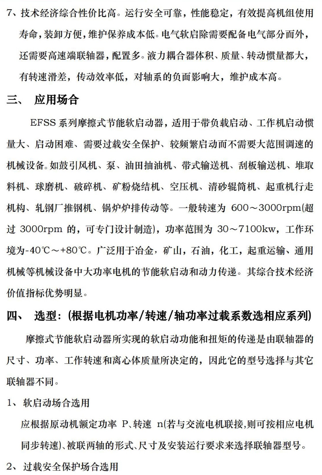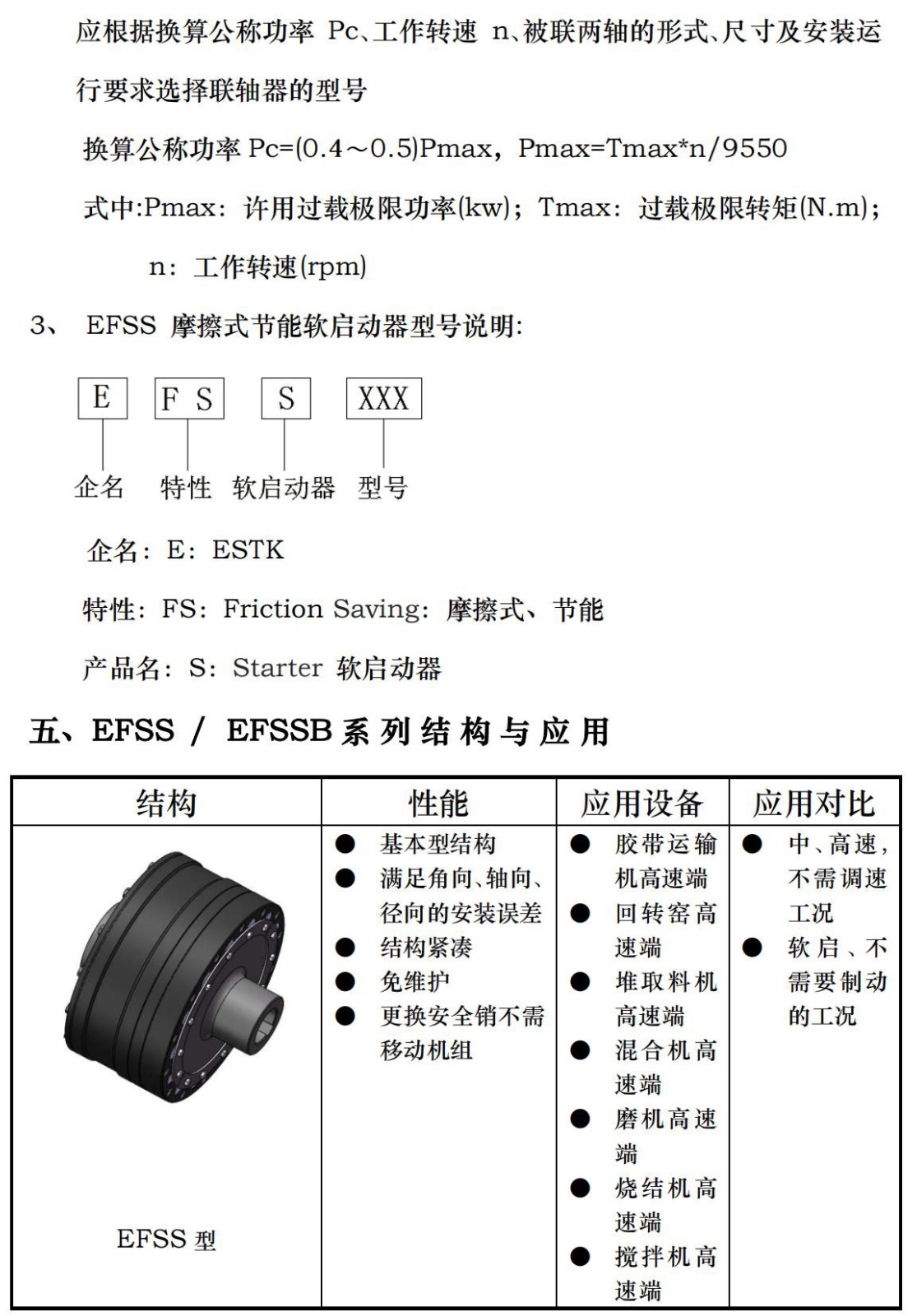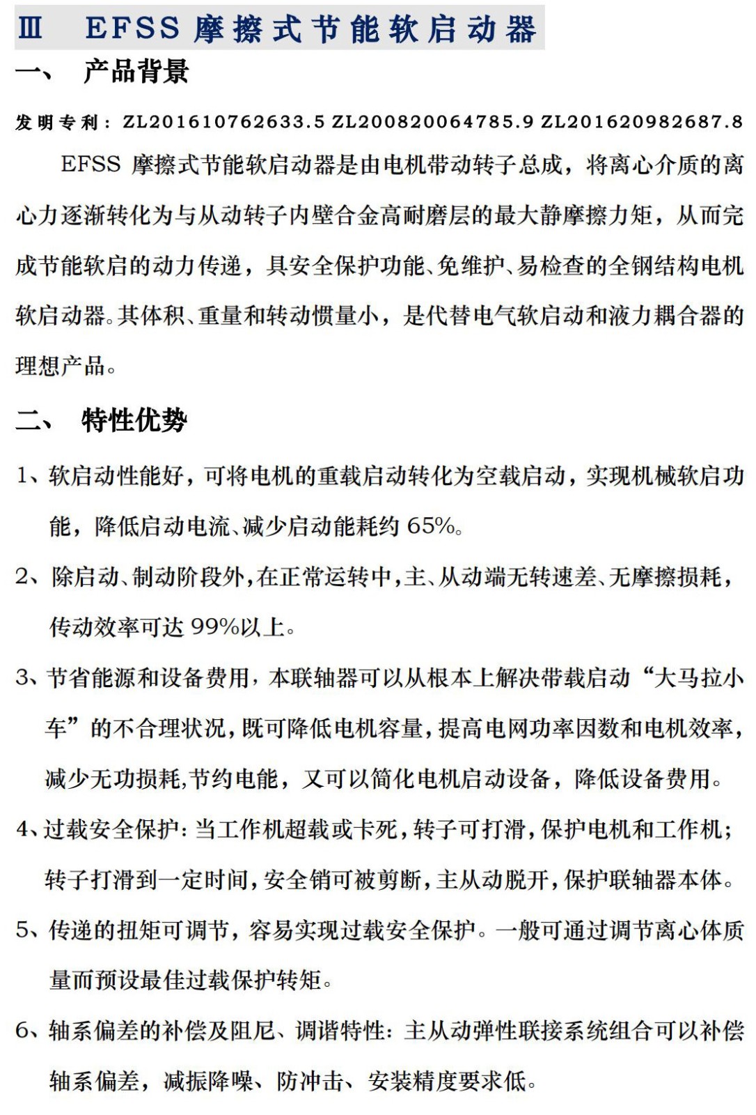 EFSS 摩擦式节能软启动器是由电机带动转子总成,将离心介质的离心力逐渐转化为与从动转子内壁合金高耐磨层的最大静摩擦力矩,从而完成节能软启的动力传递,具安全保护功能、免维护、易检查的全钢结构电机软启动器。其体积、重量和转动惯量小,是代替电气软启动和液力耦合器的理想产品。