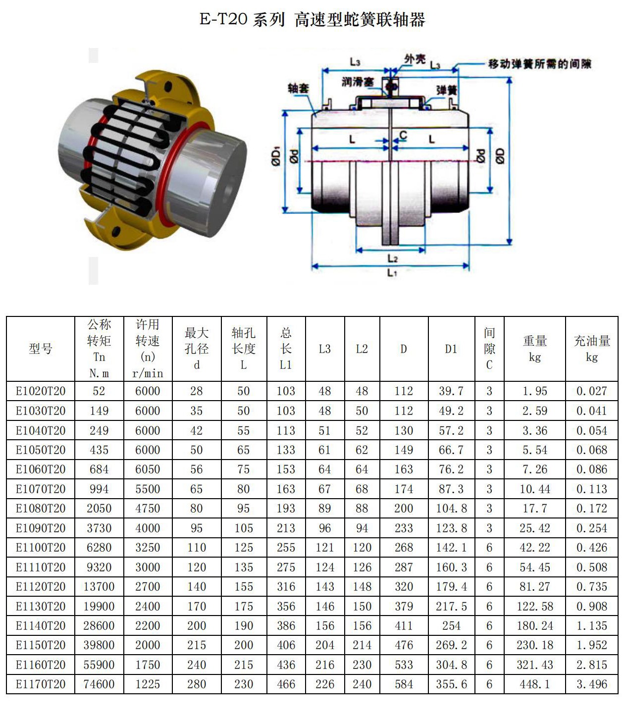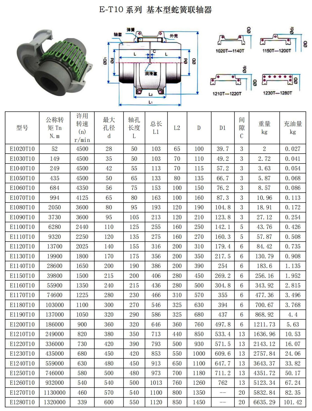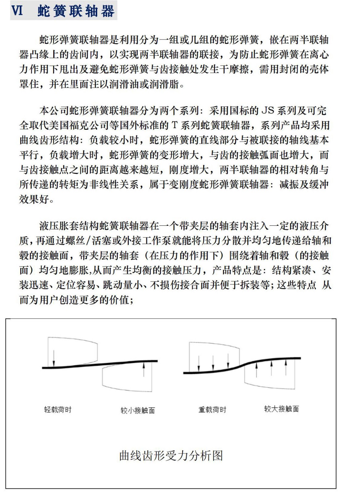 蛇形弹簧联轴器是利用分为一组或几组的蛇形弹簧,嵌在两半联轴 器凸缘上的齿间内,以实现两半联轴器的联接,为防止蛇形弹簧在离心 力作用下甩出及避免蛇形弹簧与齿接触处发生干摩擦,需用封闭的壳体 罩住,并在里面注以润滑油或润滑脂。